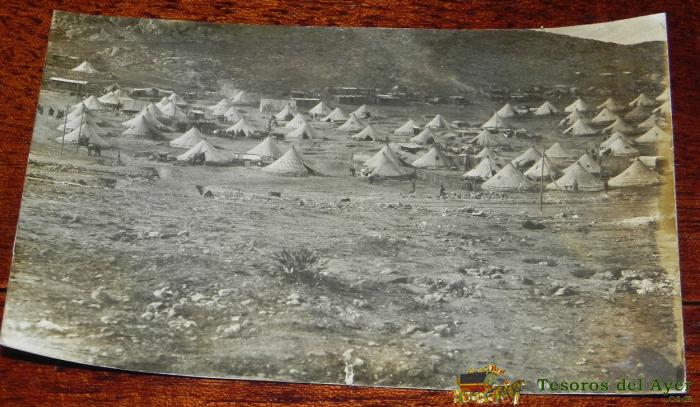 FFOTO POSTAL DE EL CAMPAMENTO MILITAR EN CALA DEL QUEMADO, ALHUCEMAS, MARRUECOS, GUERRA DEL RIF, ESCRITA.