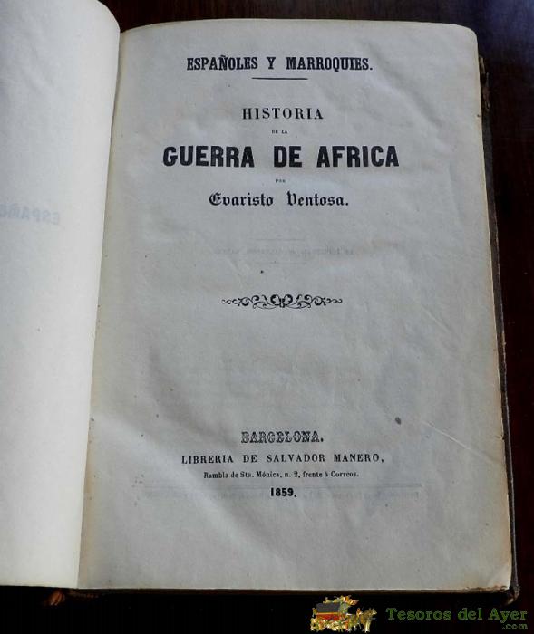 ESPAÑOLES Y MARROQUIES, HISTORIA DE LA GUERRA DE AFRICA, EVARISTO VENTOSA, 1859, LIBRERIA DE SALVADOR MANERO, TIENE 616 PAGINAS, NO LLEVA NINGUNA ILUSTRACION, PERO ES UN LIBRO MUY INTERESANTE, MIDE 23,5 X 16 CMS. UN SOLO VOLUMEN. VER LAS FOTOS PUESTAS.