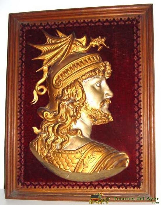 ANTIGUO CUADRO CON LA CABEZA DE EL PERSONAJE MITOLOGICO ALEMAN - SIGFRIDO - R. WAGNER - EN RELIEVE REALIZADA EN HIERRO Y ATORNILLADA AL CUADRO DE MADERA QUE MIDE 58 X 45,5 CMS - ESTE PERSONA NACE DE LA OPERA - EL OCASO DE LOS DIOSES - R. WAGNER (1813 - 1