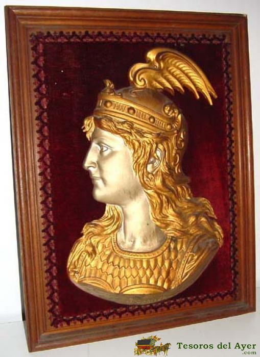 ANTIGUO CUADRO CON LA CABEZA DE EL PERSONAJE MITOLOGICO ALEMAN - BRUNHILDA - R. WAGNER - EN RELIEVE REALIZADA EN HIERRO Y ATORNILLADA AL CUADRO DE MADERA QUE MIDE 58 X 45,5 CMS - ESTE PERSONA NACE DE LA OPERA - EL OCASO DE LOS DIOSES - R. WAGNER (1813 -