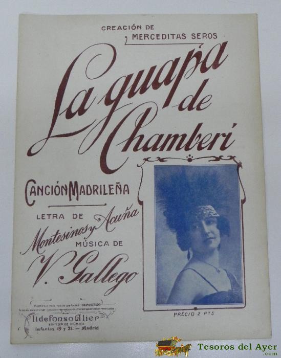 ANTIGUA PARTITURA DE LA CANCIóN MADRILEñA "LA GUAPA DE CHAMBERí, CREACIóN DE MERCEDES SERóS, MADRID, ED. ALFONSO ALIER. LETRA DE MONTESINOS Y ACUñA. MúSICA DE V. GALLEGO. LA CARáTULA REPRODUCE LA FOTOGRAFíA DE LA FAMOSA CUPLETISTA MERCEDES SERóS, 4 PAGINA