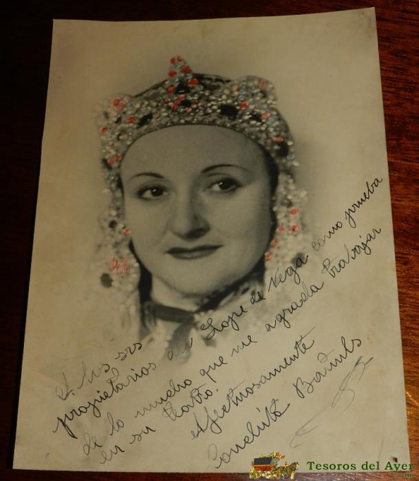 ANTIGUA FOTOGRAFIA ORIGINAL DE CONCHA BAÑULS (N. CARLET, VALENCIA; 1901 - F. MADRID; 1992), FUE UNA FAMOSA CANTANTE Y SOPRANO DE ZARZUELA DEL SIGLO XX. CON AUTOGRAFO Y DEDICATORIA PRA LOS PROPIETARIOS DEL TEATRO LOPE DE VEGA. MIDE 22,7 X 16,5 CMS.