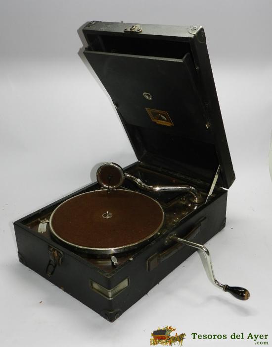 ANTIGUA GRAMOLA GRAMOFONO DE MALETA DE LA VOZ DE SU AMO, FUNCIONA, BUEN ESTADO, TAL Y COMO SE VE EN LAS FOTOGRAFIAS PUESTAS. MIDE LA MALETA CERRADA 41 X 29 X 14,5 CMS.