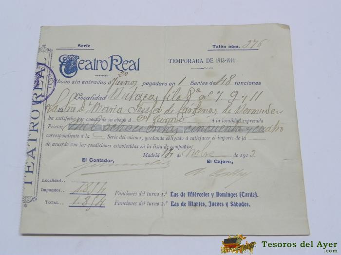ANTIGUO ABONO DE TEMPORADA DE 1913-14, PARA 48 FUNCIONES, TEATRO REAL, 14 DE NOVIEMBRE DE 1919, MIDE 18 X 15 CMS.