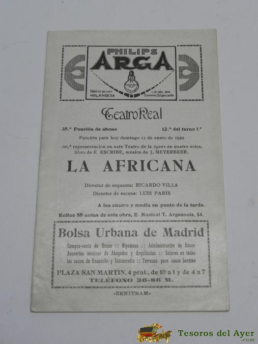 PROGRAMA DEL TEATRO REAL, 15 DE ENERO DE 1922, LA AFRICANA, TIENE 20 PAG, MIDE 18,5 X 11,5 CMS.