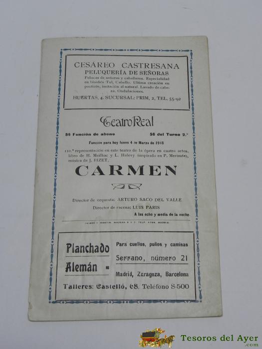 PROGRAMA DEL TEATRO REAL, 4 DE MARZO DE 1918, CARMEN, TIENE 24 PAG, MIDE 18,5 X 11,5 CMS.