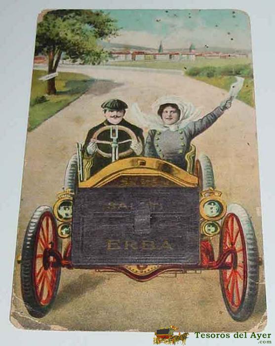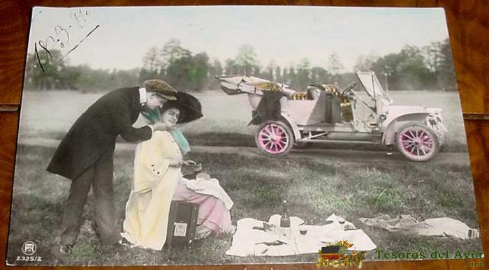 ANTIGUA POSTAL DE COCHE DE EPOCA - CON MALETIN EN RELIEVE - CIRCULADA.