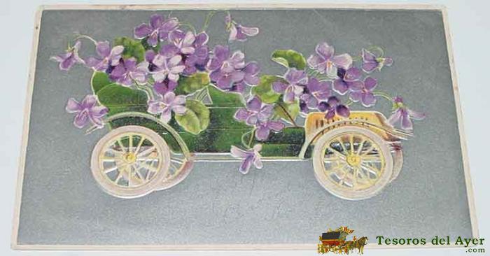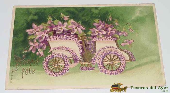 ANTIGUA POSTAL DE COCHE DE EPOCA - BONNE FETE - EN RELIEVE - NO CIRCULADA - ESCRITA.