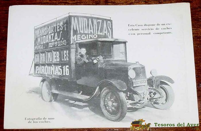 ANTIGUA POSTAL CON PUBLICIDAD TRANSPORTES Y MUDANZAS MEGINO - COCHE, AUTOMOVIL - REVEERSO CON PUBLICIDAD - GENERAL PARDIÑAS - MADRID - NO CIRCULADA.