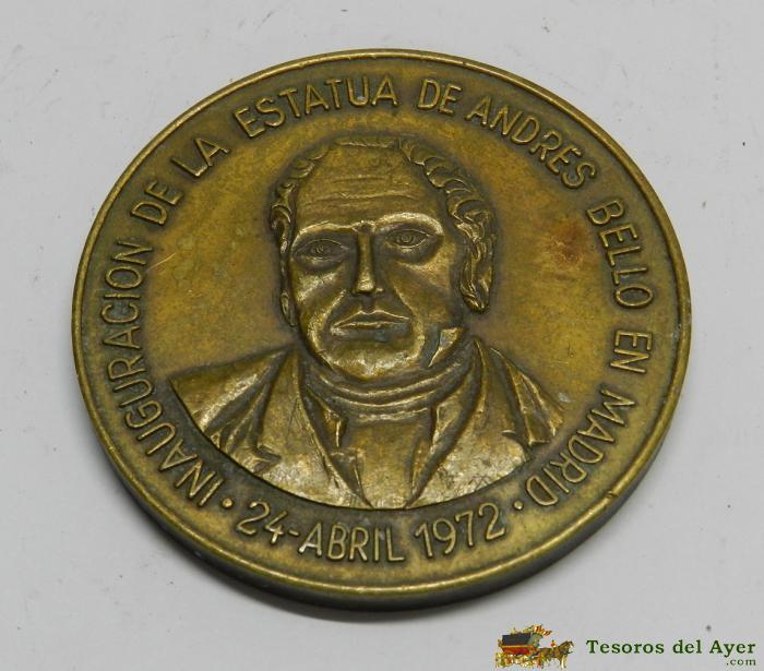 MEDALLA DE LA ESTATUA DE ANDRES BELLO EN MADRID, 24 DE ABRIL DE 1972, MEDALLA BRONCE. 6 CM. DIáMETRO. TIENE 0,5 CMS. DE GROSOR. BUENA CALIDAD.VER LAS FOTOGRAFIAS PUESTAS.