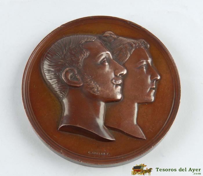 MEDALLA CONMEMORATICA DE LA BODA DEL REY ALFONSO XII Y MARIA DE LAS MERCEDES, AUTOR : G. SELLAN.F. 1878, BRONCE. MEDIDAS. 7,2 CM DE DIAMETRO. REALIZADA EN BRONCE, REVERSO: LEYENDA, ALFONSO XII, REY DE ESPAÑA. MARIA DE LAS MERCEDES REINA CASADOS EL 25 DE