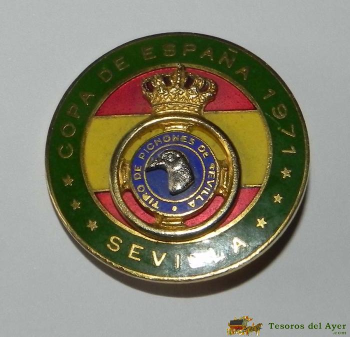 INSIGNIA ESMALTADA DE LA COPA DE ESPAÑA TIRO DE PICHONES DE SEVILLA, AÑO 1971, CAZA, MIDE 3 CMS. DE DIAMETRO.