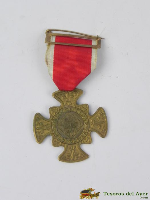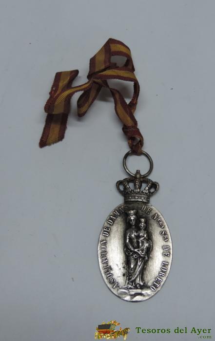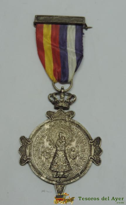 MEDALLA DE LA ASOCIACION B.V.M.D.DS. DE LA GUARDIA CIVIL, EPOCA ALFONSO XIII, CON LA IMAGEN DE LA VIRGEN DEL PILAR EN EL ANVERSO Y DEL SAGRADO CORAZON EN EL REVERSO. CINTA ORIGINAL CON LOS COLORES DEL LA BANDERA DE ESPAñA Y DE LA VIRGEN DEL PILAR. FABRICA