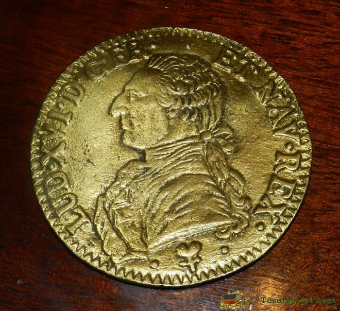 MEDALLA LUD XVI D G FR ET NAV REX, DIAMETRO 7,8 CM. REPRODUCCIÓN DEL ANVERSO DE UNA MONEDA DE LA ÉPOCA DE LUIS XVI. PARECE BRONCE.