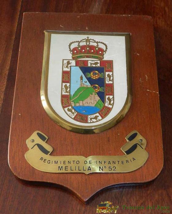 METOPA REALIZADA EN MADERA, REGIMIENTO DE INFANTERIA MELILLA N.52, MIDE 20 X 14 CMS.