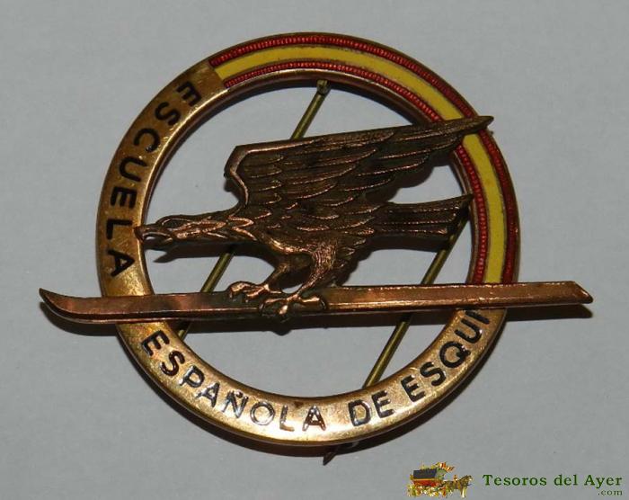 PLACA DE LA ESCUELA ESPAÑOLA DE ESQUI, CATEGORIA PLATA. METAL CROMADO Y PINTADO. DOS ENGANCHES TRASEROS - 5 CM DE DIáMETRO. PROFESORES DE ESQUI AL ACABAR SU FORMACIóN