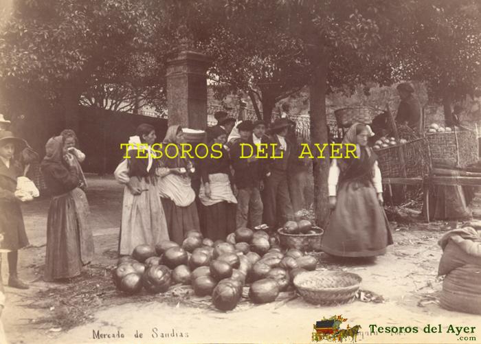 ANTIGUA FOTOGRAFIA ALBUMINA ORIGINAL DEL FOTOGRAFO FRANCISCO ZAGALA, MERCADO DE SANDIAS, PONTEVEDRA, MIDE 17 X 12 CMS. TAL Y COMO SE VE EN LA FOTOGRAFIA.EN EL REVERSO PONE F. ZAGALA. FOTOGR. EN TAMPON AZUL