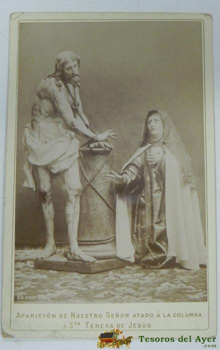 ANTIGUA FOTOGRAFIA ALBUMINA DE APARICION DE NUESTRO SEÑOR ATADO A LA COLUMNA A SANTA TERESA DE JESUS, AVILA, REVERSO CON EL ARBOL GENEALOGICO DE SANTA TERESA, A. SAENZ CORONA, MADRID, MIDE 16,5 X 10,5 CMS.