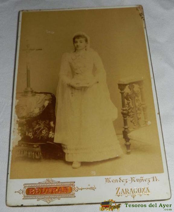 ANTIGUA FOTOGRAFIA ALBUMINA DE NIÑA EN TRAJE DE PRIMERA COMUNION, FOTOGRAFIA DE ENRIQUE BELTRAN DE ZARAGOZA FINALES SIGLO XIX, MIDE 16,5 X 10,5 CMS.