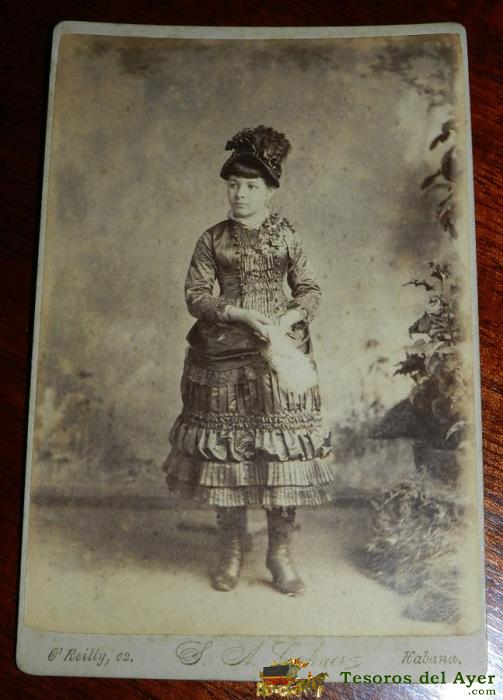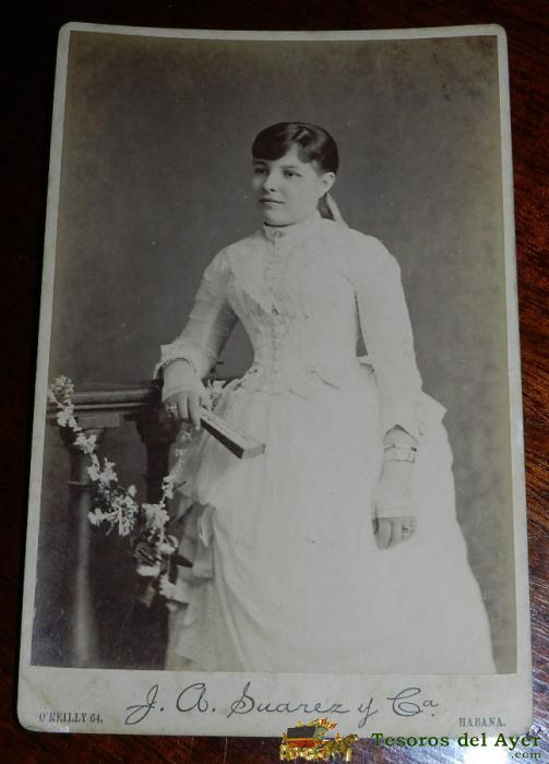 ANTIGUA FOTOGRAFIA ALBUMINA DE UNA JOVEN, FINALERS DEL SIGLO XIXS. POR EL FOTOGRAFO J. A. SUAREZ Y CIA., REALIZADA EN LA HABANA (CUBA) MIDE 16,5 X 11 CMS.