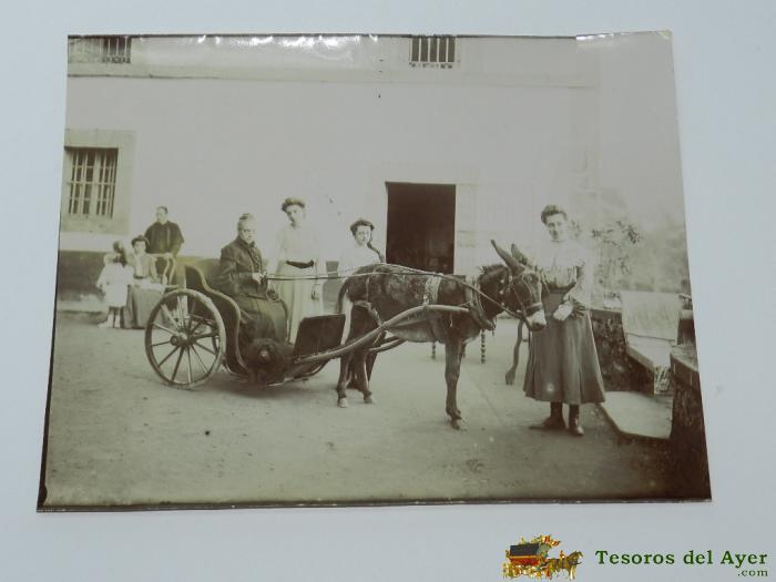 ANTIGUA FOTOGRAFIA ALBUMINA DE CARRUAJE FAMILIAR TIRADO POR UN BURRO, EN VILLA EN 1904, ESPECTACULAR. MIDE 22,7 X 17,7 CMS.
