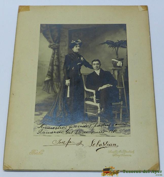 ANTIGUA FOTOGRAFIA ALBUMINADE PAREJA DE LA ARISTOCRACIA MADRILEÑA, FOTO BORKE, MADRID, CON DEDICATORIA Y FIRMA MANUSCRITA DE LOS RETRATADOS, MIDE 31,5 X 24 CMS.