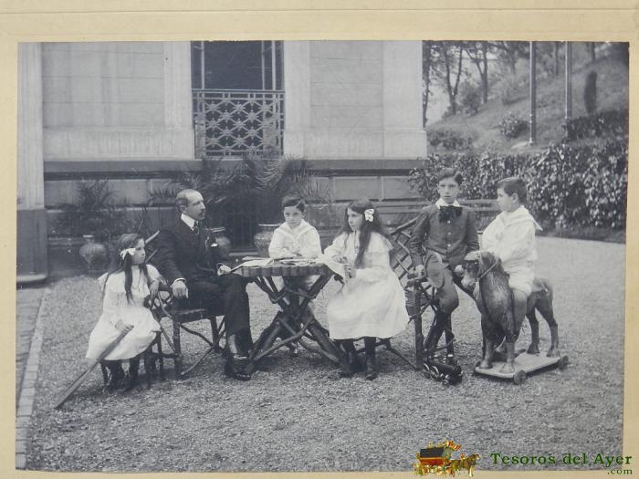 FOTOGRAFIA DE FAMILIA DE BILBAO, NIÑOS CON JUGUETES, LOCOMOTORA, CABALLITO DE CARTON, RAQUETAS, FOTO L. VALLET DE MONTANO, MIDE 29 X 21 CMS.