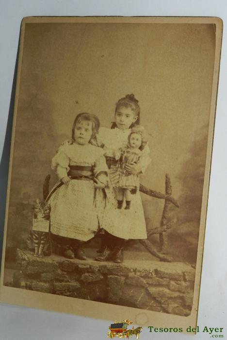 FOTOGRAFIA ALBUMINA DE NIÑAS CON MUÑECA Y GATO CON CARTEL DE PUBLICIDAD DE LA TRINIDAD (CHOCOLATE ROMERO Y GRANDE), FOT. A. NIETO, MADRID, MIDE 16 X 10,5 CMS.
