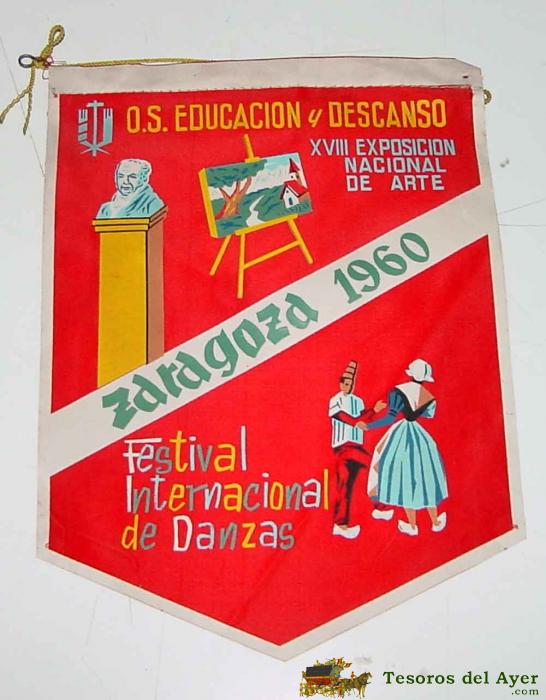 ANTIGUO BANDERIN CON PUBLICIDAD DE LA ORGANIZACION SINDICAL DE EDUCACION Y DESCANSO, ZARAGOZA 1960 . FESTIVAL INTERNACIONAL DE DANZA . XVII EXPOSICION NACINAL DE ARTE - MIDE 21,5 CMS. DE LONGITUD DE TELA.
