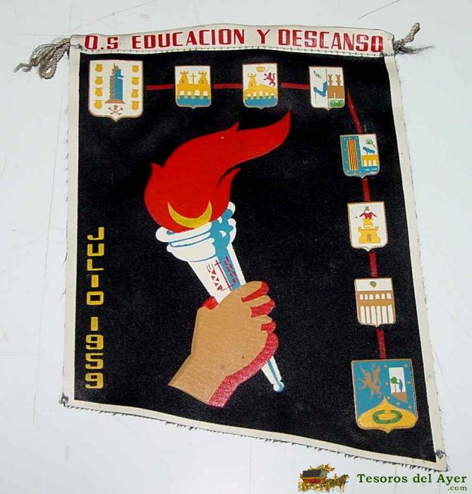 ANTIGUO BANDERIN CON PUBLICIDAD DE LA OBRA SINDICAL DE EDUCACION Y DESCANSO, JULIO 1959 - MIDE 18 CMS. DE LONGITUD DE TELA.