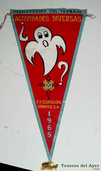 ANTIGUO BANDERIN CON PUBLICIDAD DE HERMANDADES DE TRABAJO, EXCURSION SORPRESA 1965 - MIDE 32 CMS. DE LONGITUD - TELA