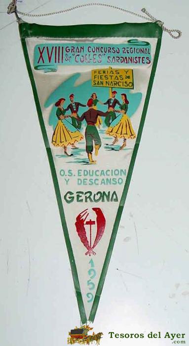 ANTIGUO BANDERIN CON PUBLICIDAD DE XVIII GRAN CONCURSO REGIONAL DE COLLES SARDANISTES, FERIAS Y FIESTAS DE SAN NARCISO, OBRA SINDICAL DE EDUCACION Y DESCANSO - GERONA 1959 - MIDE 23,5 CMS. DE LONGITUD - TELA