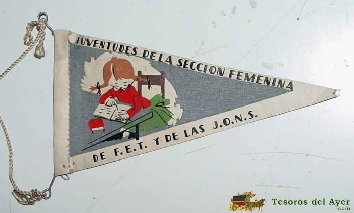 ANTIGUO BANDERIN CON PUBLICIDAD DE JUVENTUDES DE LA SECCION FEMENINA, DE F.E.T. Y DE LAS J.O.N.S. - MIDE 14 CMS. DE LONGITUD - TELA