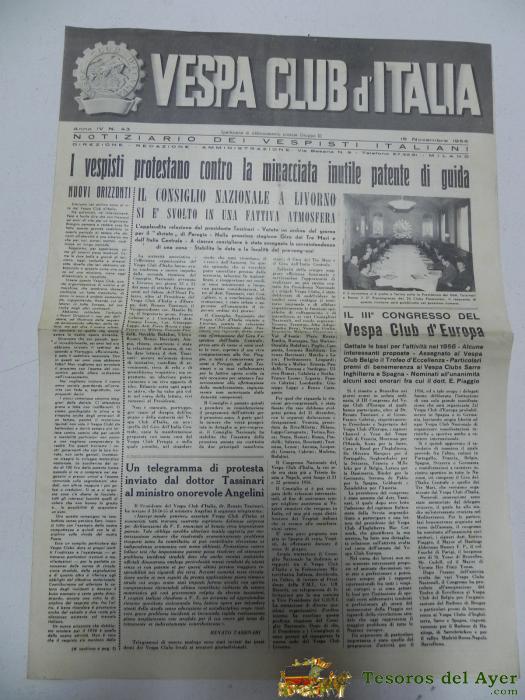VESPA CLUB D´ITALIA, NOTICIARIO DEL VESPISTA ITALIANO, N. 43, NOVIEMBRE DE 1955, CON MUCHISIMAS FOTOGRAFIAS, 4 PAG, MIDE 42 X 29,5 CMS.
