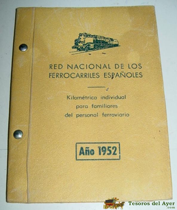 RED NACIONAL DE LOS FERROCARRILES ESPAÑOLES - RENFE - 1952 - KILOMETRICO INDIVIDUAL PARA FAMILIARES DE PERSONAL FERROVIARIO - 16 X 11,5 CMS