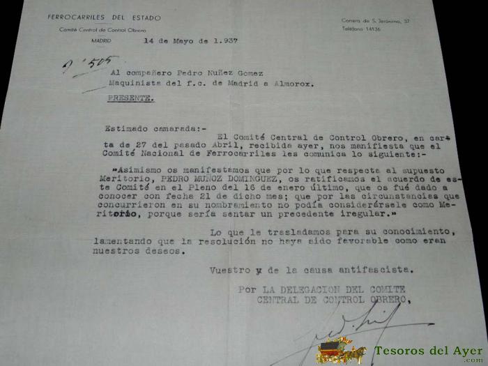 ANTIGUO DESPACHO GUERRA CIVIL, FERROCARRILES DEL ESTADO, COMITE CENTRAL DE CONTROL OBRERO, MADRID, 14 DE MAYO DE 1937, MUY CURIOSO CON EXPRESIONES COMO VUESTRO Y DE LA CAUSA ANTIFASCISTA, MIDE 28 X 21,5 CMS. TREN, FERROCARRIL.