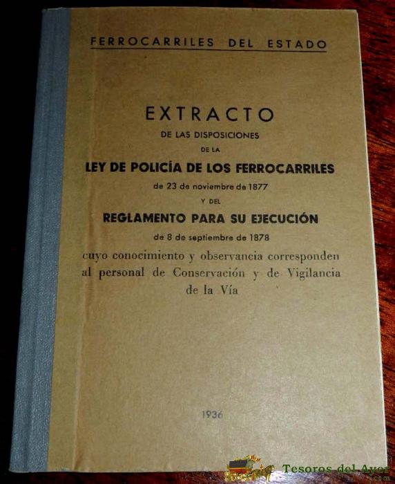 ANTIGUO EXTRACTO DE LAS DISPOSICIONES DE LA LEY DE POLICIA DE LOS FERROCARRILES Y DEL REGALMENTO PARA SU EJECUCION, FERROCARRILES DEL ESTADO, AÑO 1936, 18 PAG. MIDE 17 X 12,5 CMS.