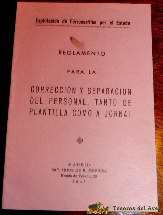 ANTIGUO REGLAMENTO DE LA EXPLOTACION DE FERROCARRILES POR EL ESTADO, REGLAMENTO PARA LA CORRECCION Y SEPARACION DEL PERSONAL, TANTO DE PLANTILLA COMO A JORNAL, AÑO 1933, II REPUBLICA, MIDE 15,4 X 10,5 CMS., 14 PAG.