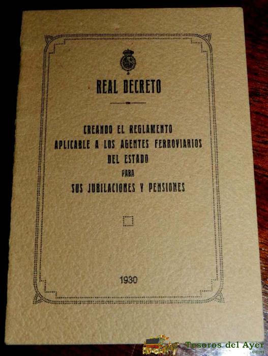 ANTIGUO REAL DECRETO, CREANDO EL REGLAMENTO APLICABLE A LOS AGENTES FERROVIARIOS DEL ESTADO PARA SUS JUBILACIONES Y PENSIONES, AÑO 1930, MIDE 15 X 10,3 CMS., 20 PAG.