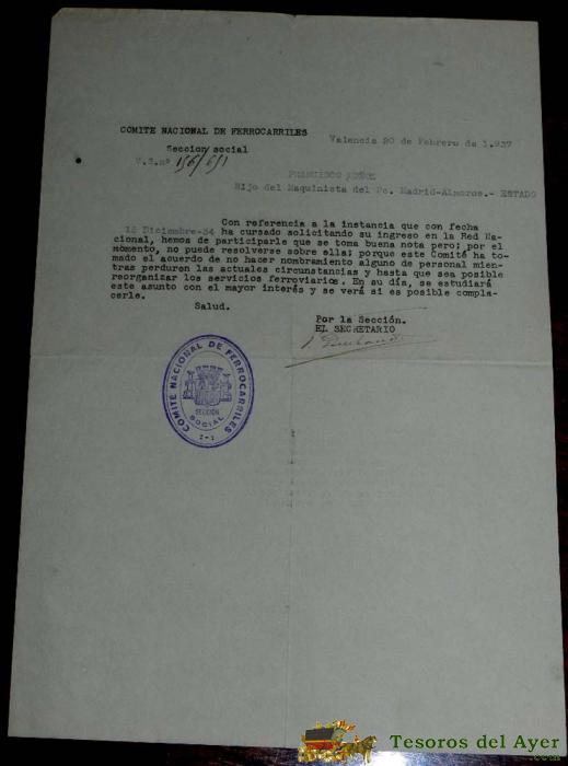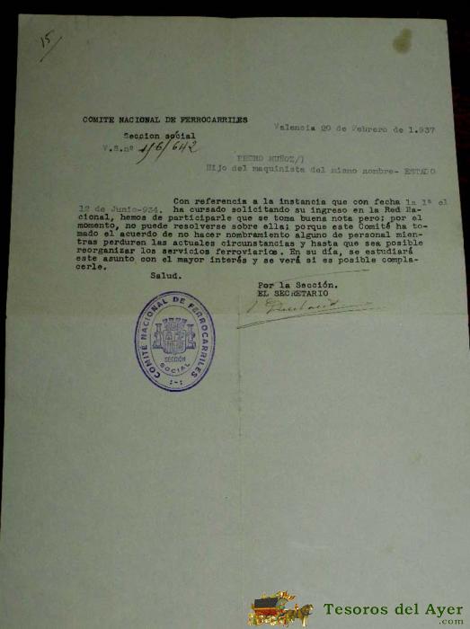 DESPACHO DEL COMITE NACIONAL DE FERROCARRILES, PLENA GUERRA CIVIL, 20 DE FEBRERO DE 1937, TAL COMO SE VE EN LAS FOTOS, TAMAÑO FOLIO.