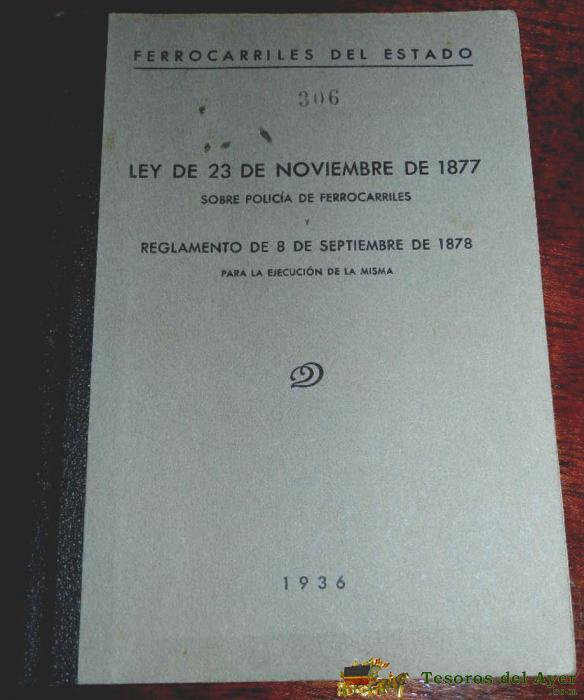 ANTIGUO REGLAMENTO DE FERROCARRILES DEL ESTADO, LEY DE 23 DE NOVIEMBRE DE 1877, SOBRE LA POLICIA DE FERROCARRILES, REGLAMENTO DE 8 DE SEPTIEMBRE DE 1878 PARA LA EJECUCION DE LA MISMA, AÑO 1936, GUERRA CIVIL, 125 PAG, MIDE 17 X 12,5 CMS.