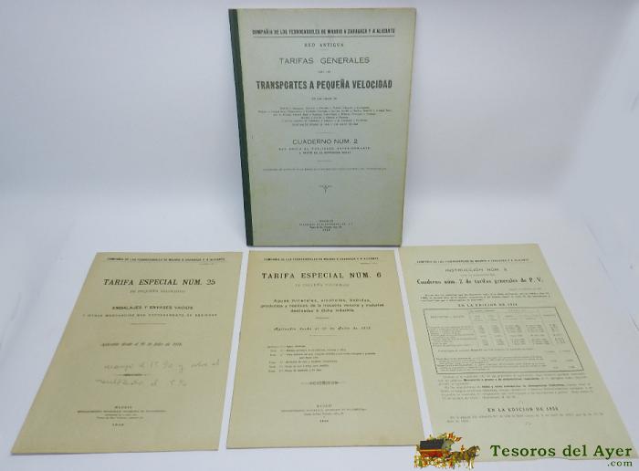 COMPAÑIA DE LOS FERROCARRILES DE MADRID A ZARAGOZA Y A ALICANTE, RED ANTIGUA, TARIFAS GENERALES PARA LOS TRANSPORTES A PEQUEÑA VELOCIDAD, CUADERNO NUM. 2, MADRID, SUCESORES DE RIVADENEYRA, AÑO 1925, 67 PAG. MIDE 31 X 23,5 CMS. JUNTO CON OTROS 3 FOLLETOS D