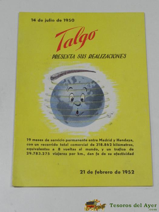 RESUMEN DEL HISTORIAL DEL TREN TALGO, LOS PRIMEROS 19 MESES DE SERVICIO, 14 DE JULIO 1950 A 21 DE FEBRERO DE 1952, TIENE 12 PAG. CON MUCHISIMAS FOTOGRAFIAS, EXCELENTE ESTADO, MIDE 21,5 X 15,5 CMS.