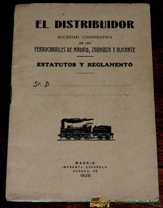 EL DISTRIBUIDOR, SOCIEDAD COOPERATIVA DE LOS FERROCARRILES DE MADRID, ZARAGOZA Y ALICANTE, ESTATUOS Y REGLAMENTO, 1925, TIENE 28 PAGINAS Y MIDE 16 X 10,5 CMS. TREN, FERROCARRIL.