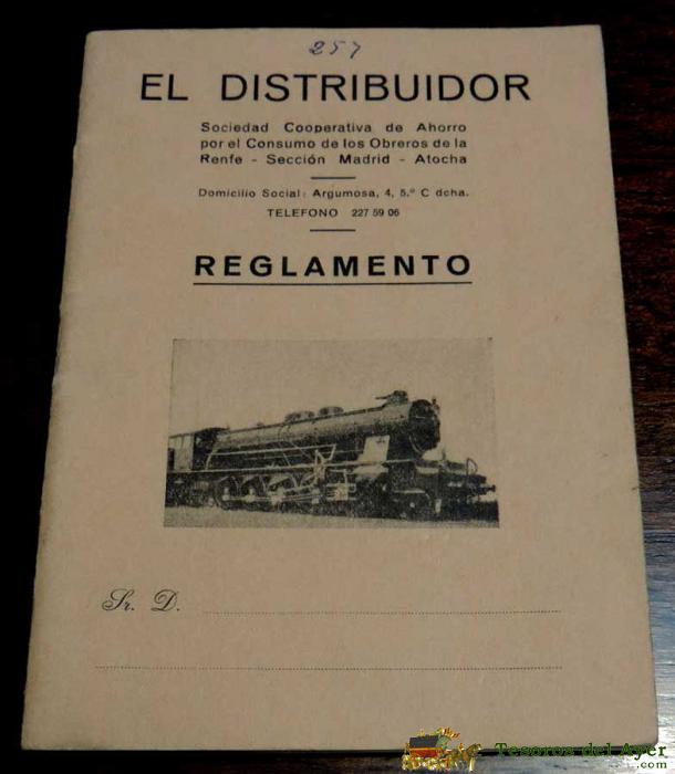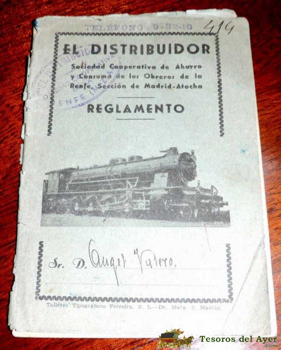 EL DISTRIBUIDOR, SOCIEDAD COOPERATIVA DE AHORRO POR EL CONSUMO DE LOS OBREROS DE LA RENFE, SECCION DE MADRID, ATOCHA, REGLAMENTO, 1959, TIENE 38 PAGINAS Y MIDE 16 X 10,5 CMS. TREN, FERROCARRIL.