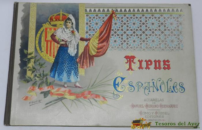 ALBUM TIPOS ESPAñOLES, ACUARELAS DE MORENO RODRÍGUEZ, MANUEL, ED. ROMO Y FüSSEL S.A. (C. 1890), MADRID, 1890. 4º APAISADO (35,6 X 23,9 CM.). PORTADA, 20 LáMINAS CROMOLITOGRáFICAS A TODA PLANA, DE TIPOS REGIONALES ESPAñOLES, Y 9 H. DE PARTITURA DE MúSICA.