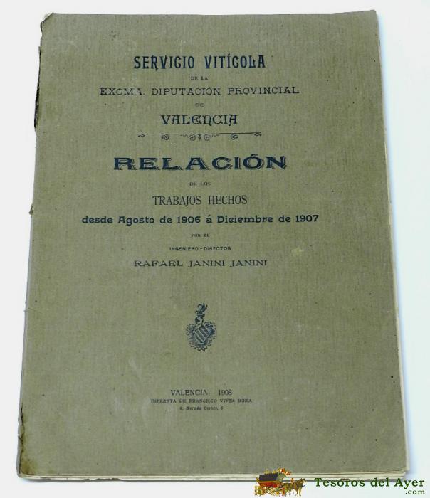 SERVICIO VITICOLA DE LA EXCMA. DIPUTACION PROVINCIAL DE VALENCIA, VINO, LICOR, RELACION DE LOS TRABAJOS HECHOS DESDE AGOSTO DE 1906 A DICIEMBRE DE 1907, POR EL INGENIERO RAFAEL JANINI JANINI, VALENCIA 1908, TIENE 108 PAG. CON MUCHAS FOTOGRAFIAS, MIDE 27,5