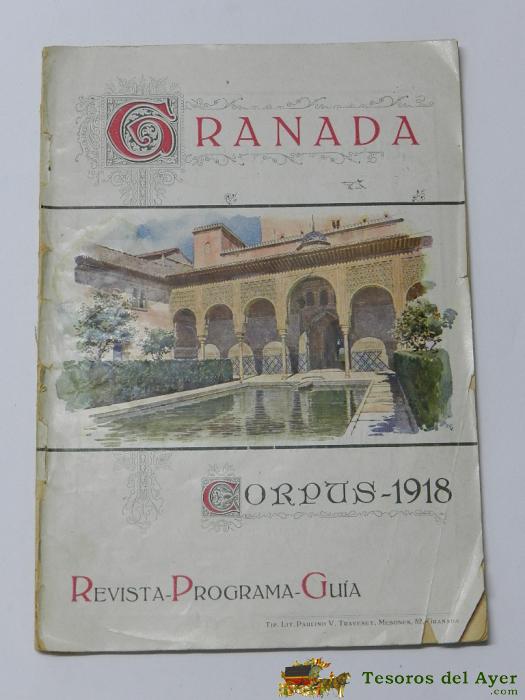PROGRAMA DE LAS FIESTAS DEL CORPUS Y GUíA DEL AñO 1918, TIP. LIT. PAULINO V. TRAVESET, íNTEGRAMENTE PLAGADO DE PROPAGANDA COMERCIAL DE LA éPOCA; MIDE 21 CMS, CON 34 PAG. PORTADA PINTADA A TODO COLOR CON MOTIVOS DE LA ALHAMBRA. FALTA CONTRAPORTADA, MUY INT