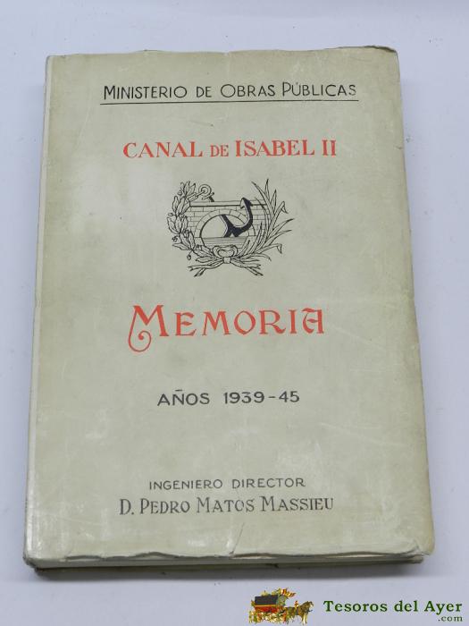 MEMORIA CANAL DE ISABEL II. AñOS 1939-45. - MATOS MASSIEU, PEDRO. MINISTERIO DE OBRAS PúBLICAS, AñO 1947, MADRID. - MIDE 24 X 17 CMS. TIENE 389 PGS. 19 GRáFICOS PLEGADOS FUERA DE TEXTO.