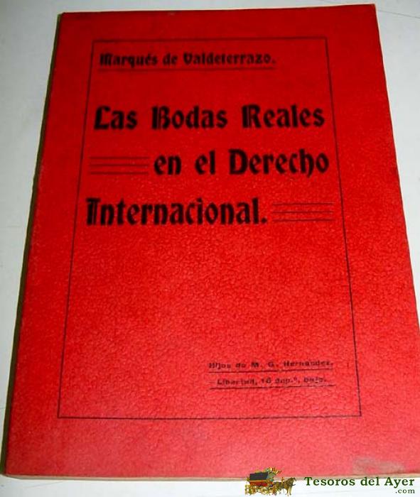 LAS BODAS REALES EN EL DERECHO INTERNACIONAL - VALDETERRAZO, MARQUES DE - 1906, 19 CM., 178 PAG., HOLANDESA MEDIA PIEL MODERNA, CONSERVA CUBIERTAS ORIGINALES. CONFERENCIA PRONUNCIADA EN LA REAL ACADEMIA DE JURISPRUDENCIA Y LEGISLACIóN. IMP. DE LOS HIJOS